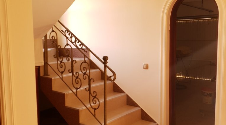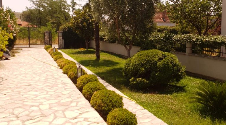 Outside, the 731 m² plot is enclosed by a stone wall, ensuring privacy and security, and features an automatic watering system for easy garden maintenance.