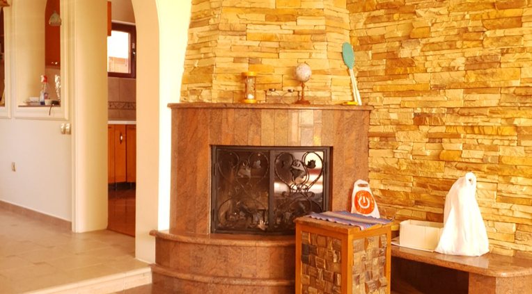 The house is equipped with a wireless alarm system, video intercom, remote-controlled entrance gate and garage door, central heating system, and a central fireplace in the living room.