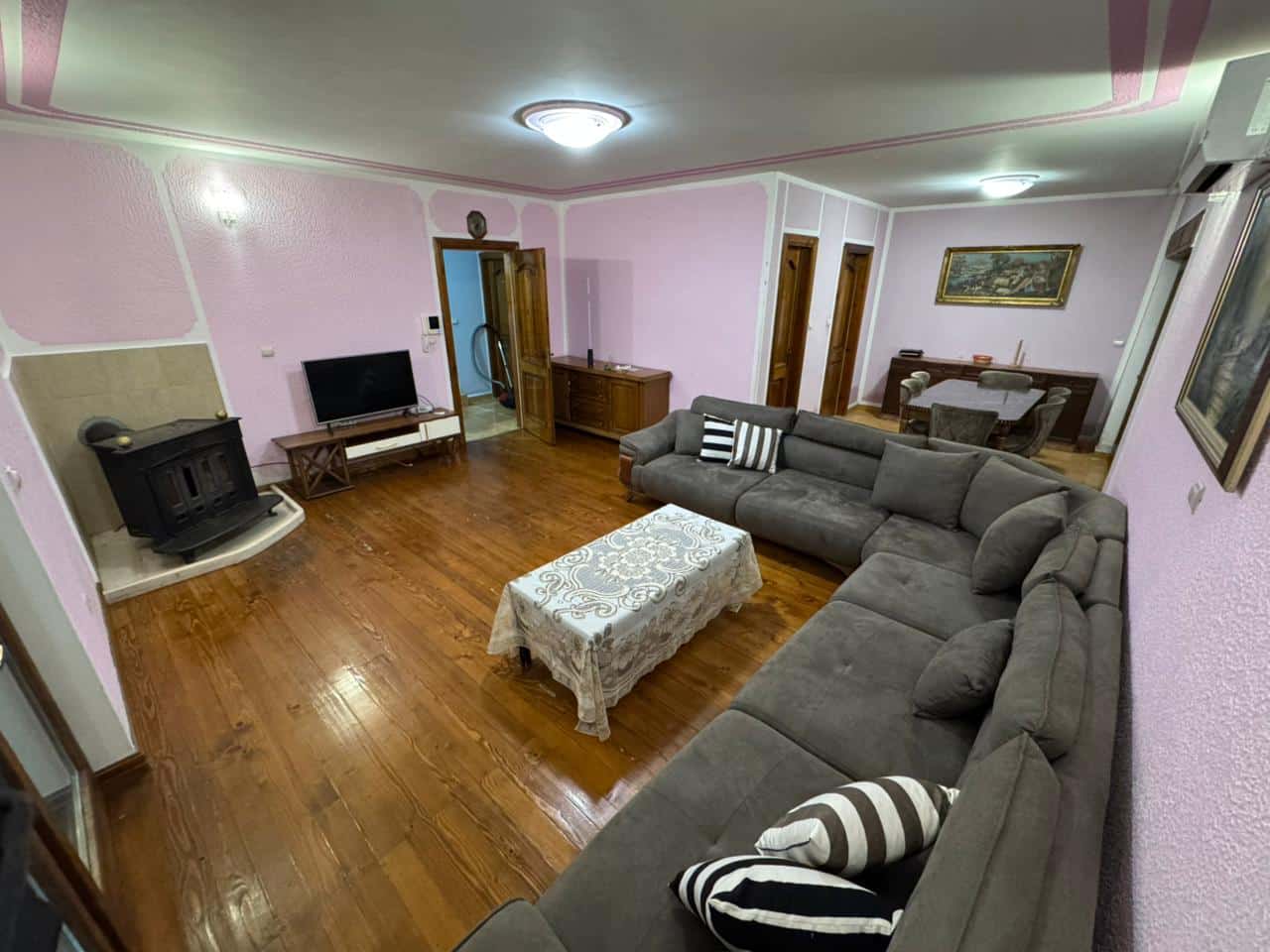 A large, family-friendly house, very conditional. On the ground floor separate one bedroom apartment, on the first floor three bedroom (separate entrances on two sides), partially equipped, with two toilets, separate kitchen, two storage rooms. The living room is extremely large with plenty of sunlight and a large fireplace.