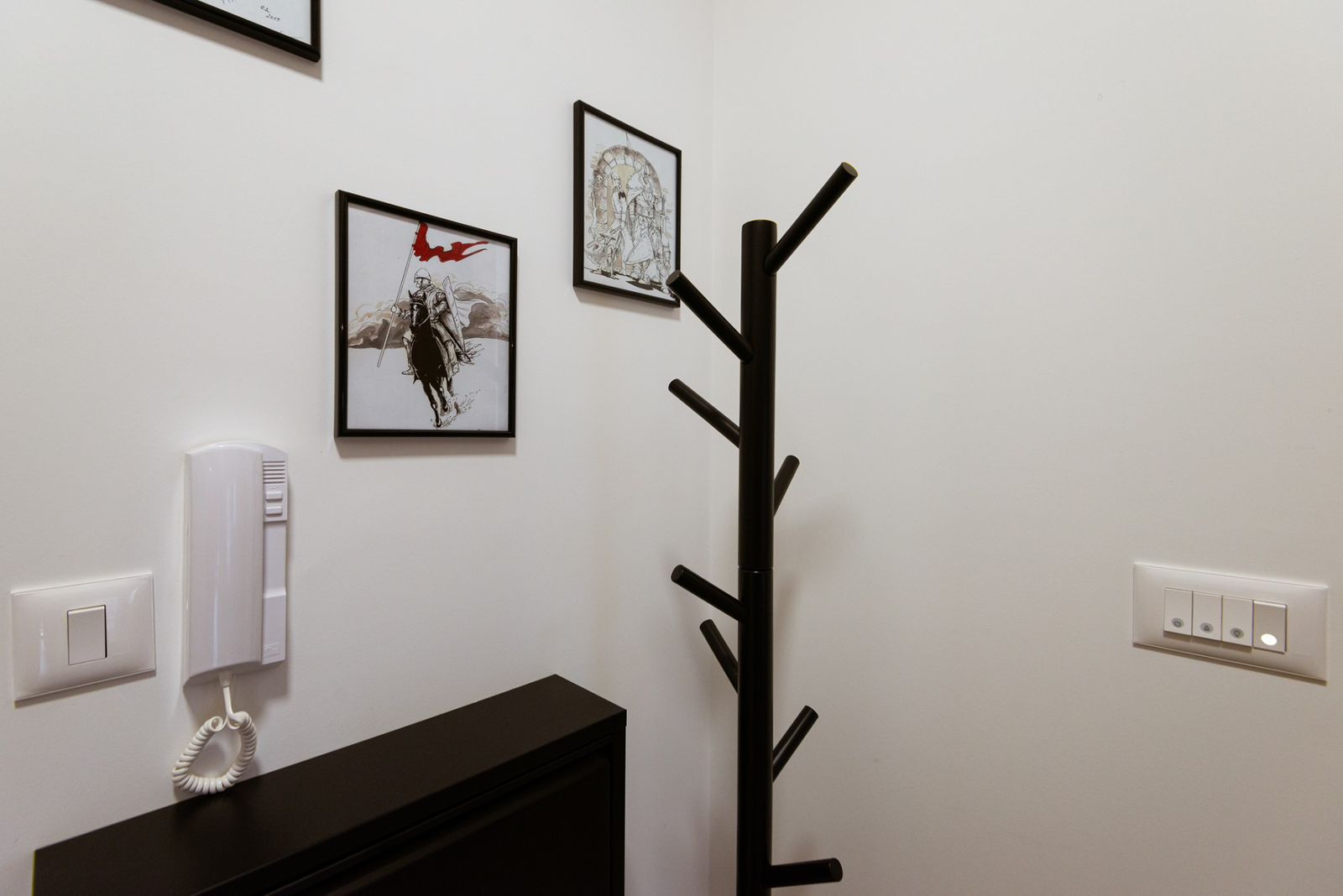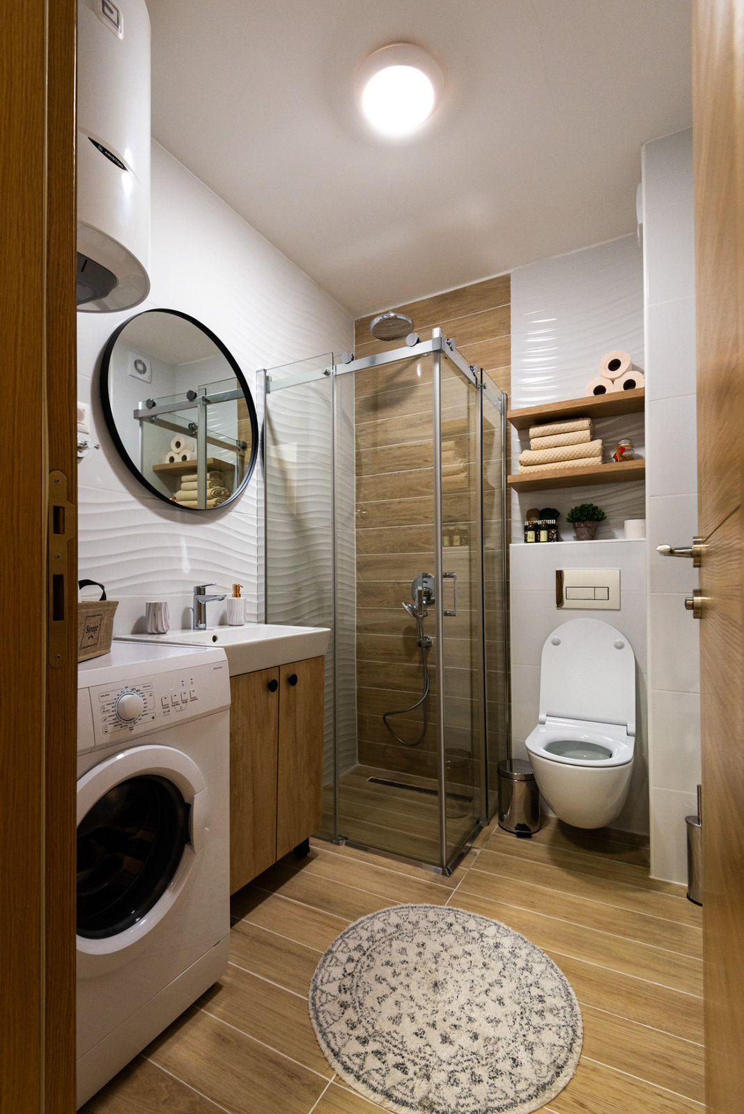The entrance hall has ceramic flooring, a shoe cabinet, mirror and coat rack. The bathroom is modern, with a shower cabin and washing machine.