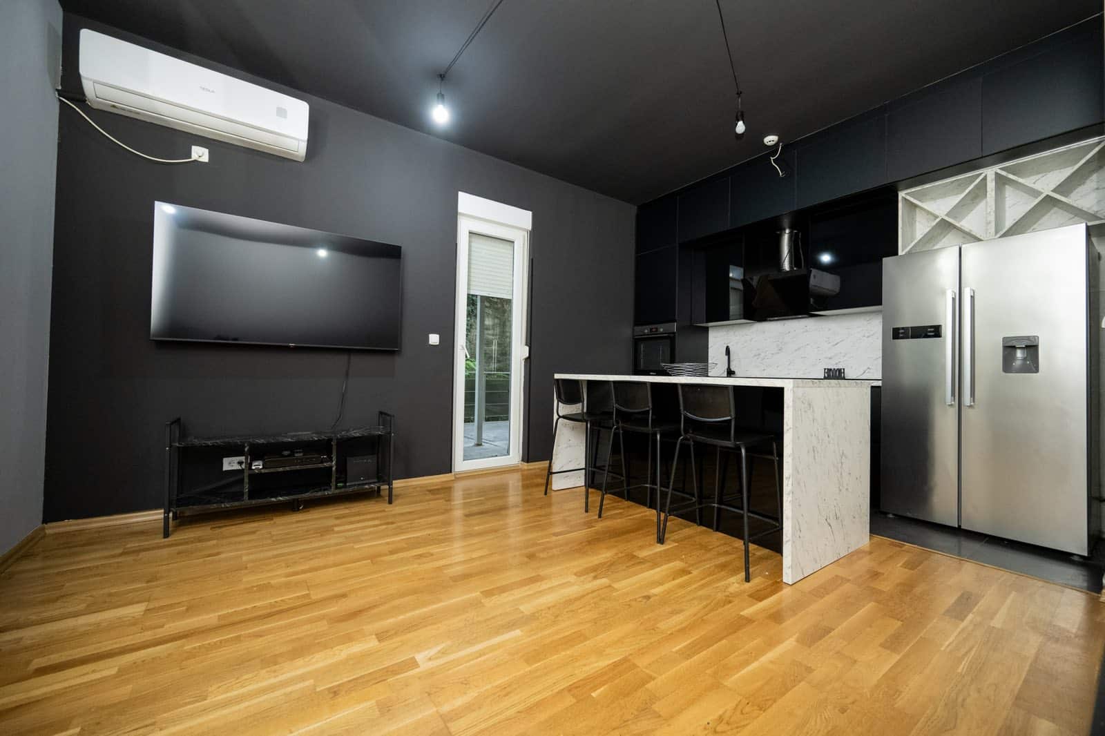 The apartment includes an induction cooktop, 24 BTU air conditioner, dishwasher, washer and dryer.