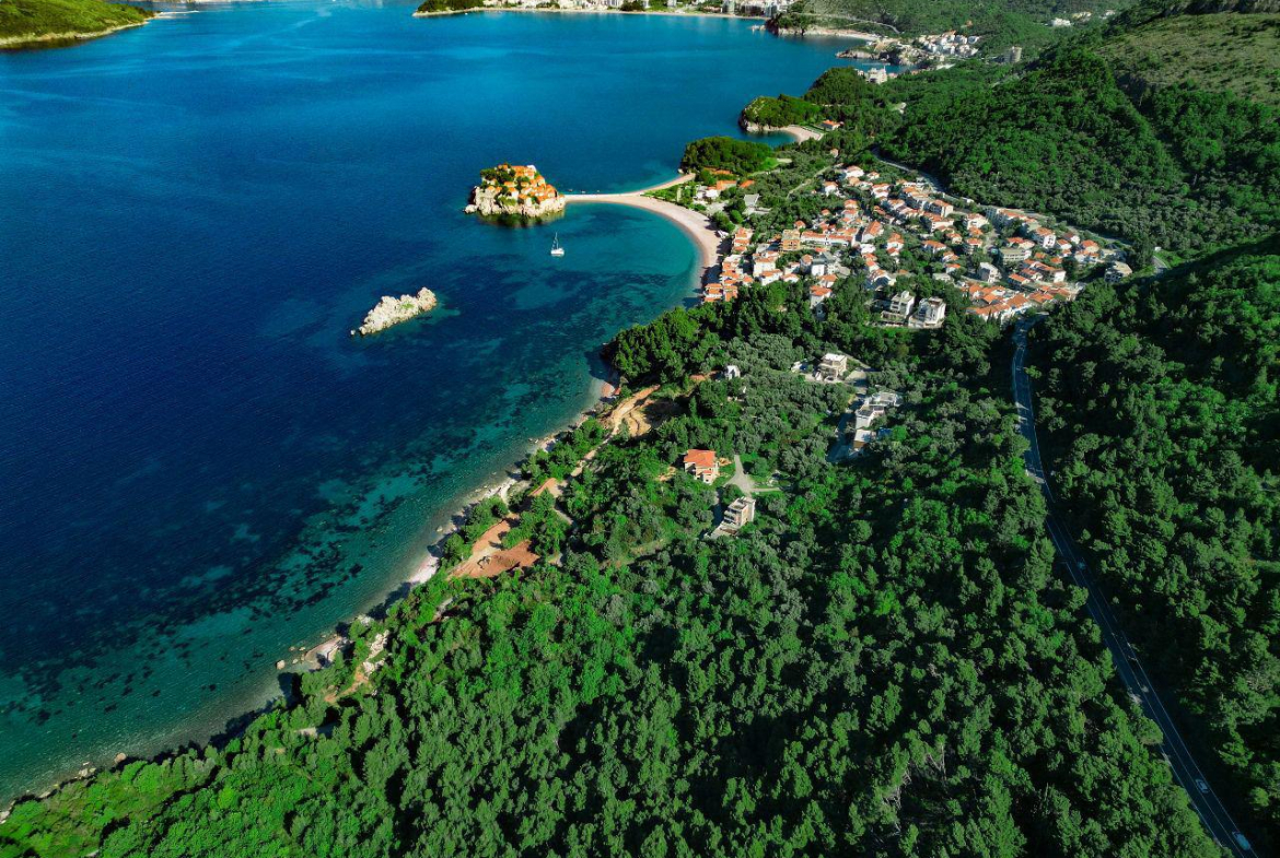 For sale: an urbanized plot of 2,390 m² located in the prestigious Sveti Stefan area — just 100 meters from the crystal-clear sea.