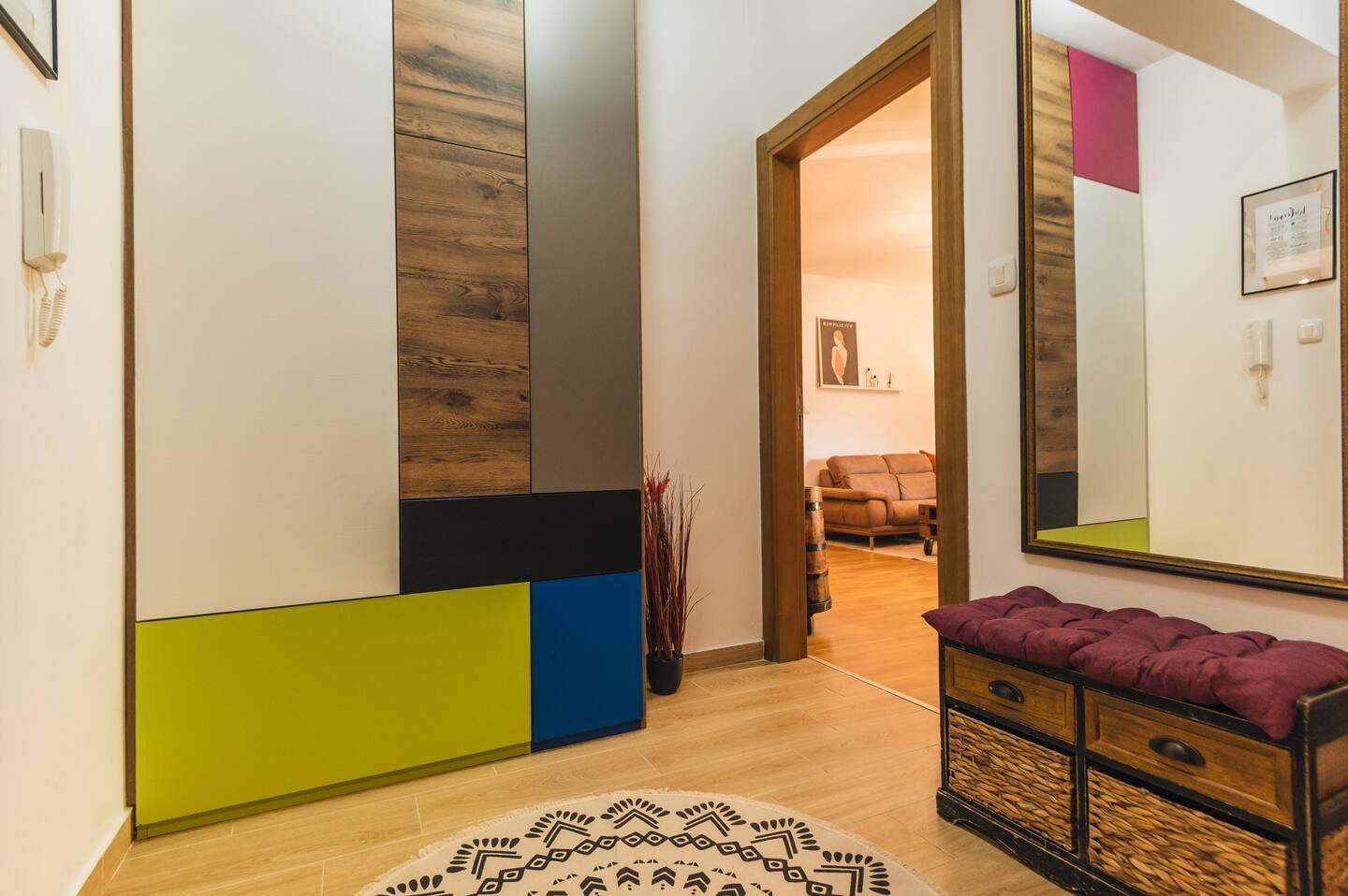 Entrance hallway with ceramic flooring, mirror, large shoe cabinet, and coat rack