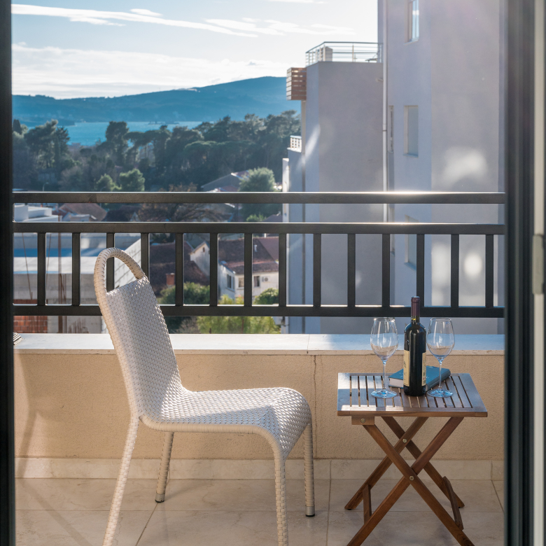 A bright, modern, and luxurious two-bedroom apartment of 63 m² with a sunny terrace and sea view, located in the quiet area of Tivat – Pod Kuk.
